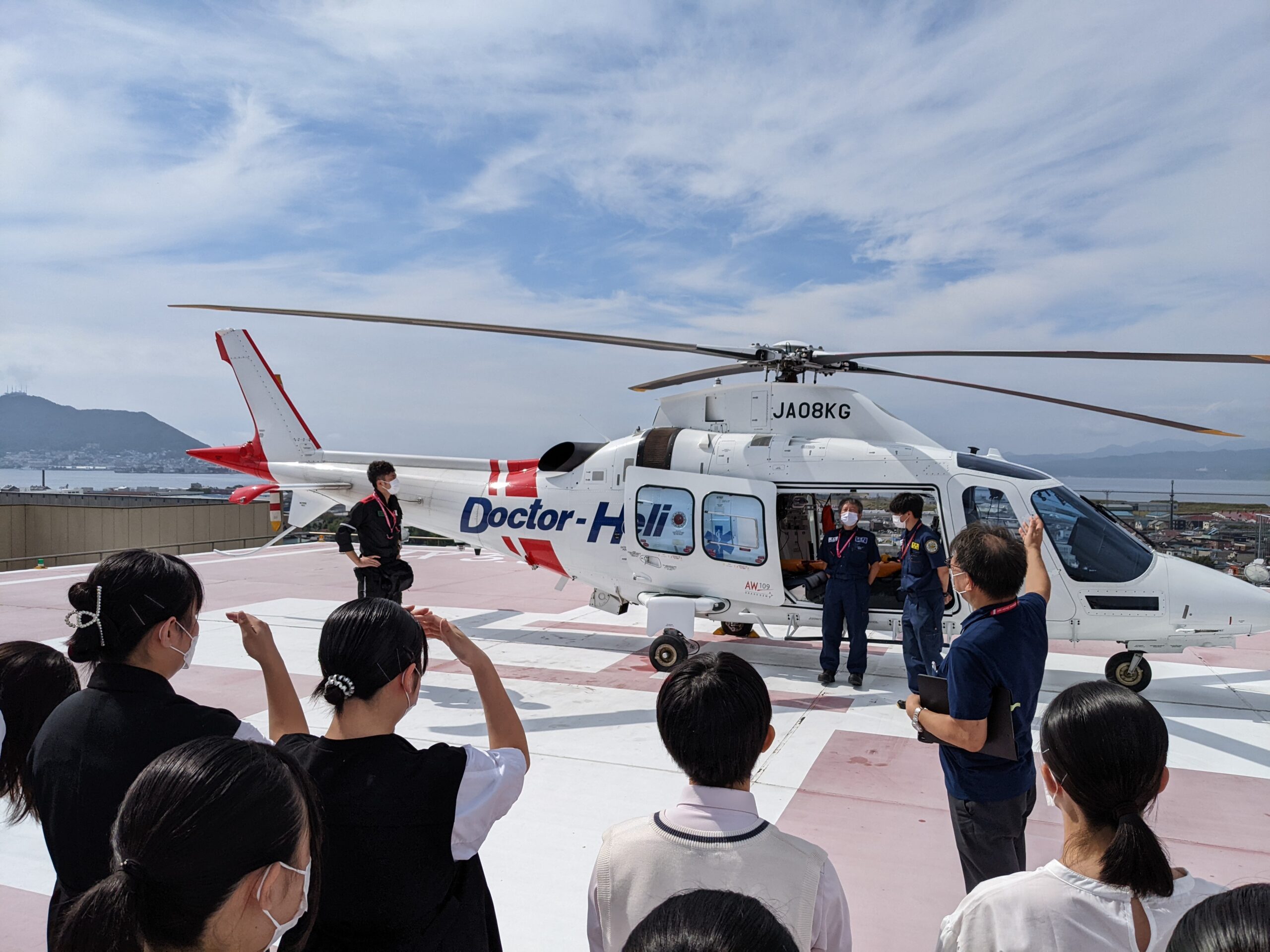 学校見学や実習室での看護体験、在校生の学習ノートや卒業アルバムの展示コーナーを見ていただきました。看護体験コーナーでは3年生と2年生が対応してくれました。市立函館病院の屋上に駐機しているドクターヘリの見学は天候にも恵まれ、機体の説明や活動内容について皆さん熱心に聞かれていました。